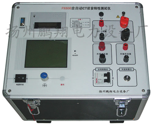 PX600全自动CT伏安特性测试仪,是一种专门为测试电流互感器:伏安特性、变比、极性、误差曲线、计算拐点和二次侧回路检查等设计的多功能现场试验仪器。实验时仅需设定测试电压/电流值,设备便能够自动升压/升流,并将互感器的伏安特性曲线或变比、极性等实验结果快速显示出来,支持数据保存和现场打印,不但省去手动调压、人工记录、描曲线等繁琐劳动,还能通过USB接口将测试数据上传到电脑进行编辑保存或打印。操作简单方便,提高工作效率,是一种性价比较高的高科技产品。 一、安全可靠: 国内首创MBC电源控制技术,单相AC220V输入电源,并且工作电源与功率电源共用一个输入端口,设计更加科学合理,使用更加安全可靠。 注:其他同类产品工作电源与功率电源是分开输入方式,并且还需要使用三相AC380V双火线输入才能满足实验要求,存在极大的安全隐患,容易造成使用人员触电甚至伤亡等事故。 二、符合国家检修规程: 设备电源输出全部为真实电压和电流值,并且波形为标准正弦波,频率为50-60Hz;能够真正有效模拟互感器的真实状态,符合国家相关检修规定。 三、输出容量大: 单机220V输入时最大电压输出0-1000V,单机最大电流输出0-600A,非常适合现场检修使用。 四、功能齐全: 可检测CT的伏安特性、变比、极性、5%和10%误差曲线、CT一次通流和CT退磁等项目,轻松实现一机多用。 五、接线方式简单: 采用单电源输入端口;仅有6个测试端口就可完成CT所有测试项目,接线方式安全简单,非常适合现场使用,能够有效降低劳动强度,提高工作效率; 六、快速打印: 采用热敏打印机,自动筛选打印典型报告使用数据,非常适合进行现场数据对比。 七、大容量FLASH存储:可保存1000组试验数据,掉电后可保存10年。 八、USB接口:方便连接新式笔记本电脑。 九、体积小,重量轻:方便现场使用。 主要检测功能: